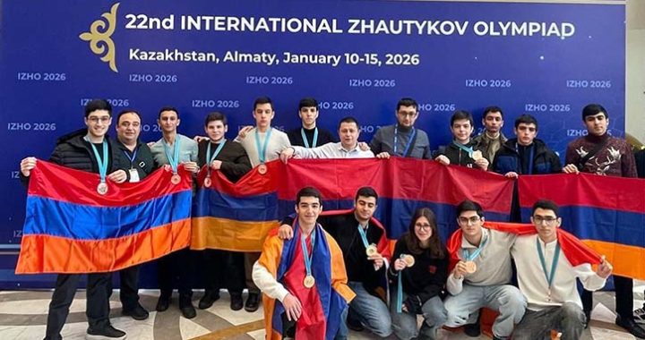 17.01.2026 — Ֆիզմաթցիները վերադարձան 2 ոսկե, 1 արծաթե և 8 բրոնզե մեդալներով Ժաուտիկովյան միջազգային 22-րդ օլիմպիադայից.. Posted on 20 Հունվարի, 202620 Հունվարի, 2026 by narine Ուրախ ենք հայտնել, որ Ֆիզմաթի սովորողները 11 մեդալ են նվաճել Ալմաթիում հունվարի 10-15-ը կայացած Ժաուտիկովյան օլիմպիադայում։ Մեդալակիրներն են՝ Մաթեմատիկա Սարգիս Առաքելյան /ոսկե մեդալ/ Արսեն Մակարյան /ոսկե մեդալ/ Արման Ասատրյան /արծաթե մեդալ/ Նարե Սմբատյան /բրոնզե մեդալ/ Գրիգոր Սամվելյան /բրոնզե մեդալ/ Ֆիզիկա Գոռ Հովսեփյան /բրոնզե մեդալ/ Դավիթ Սահակյան /բրոնզե մեդալ/ Ինֆորմատիկա Տիգրան Մացակյան /բրոնզե մեդալ/ Վահան Աբրահամյան /բրոնզե մեդալ/ Մակար Դիլանյան /բրոնզե մեդալ/ Վահագն Գյոզալյան /բրոնզե մեդալ/ Այս տարի Ժաուտիկովյան միջազգային օլիմպիադային մասնակցում էին 16 երկրների շուրջ 60 թիմեր և անկախ մասնակիցներ՝ ընդհանուր առմամբ մոտ 700 աշակերտ։ Շնորհավորում ենք բոլորին։